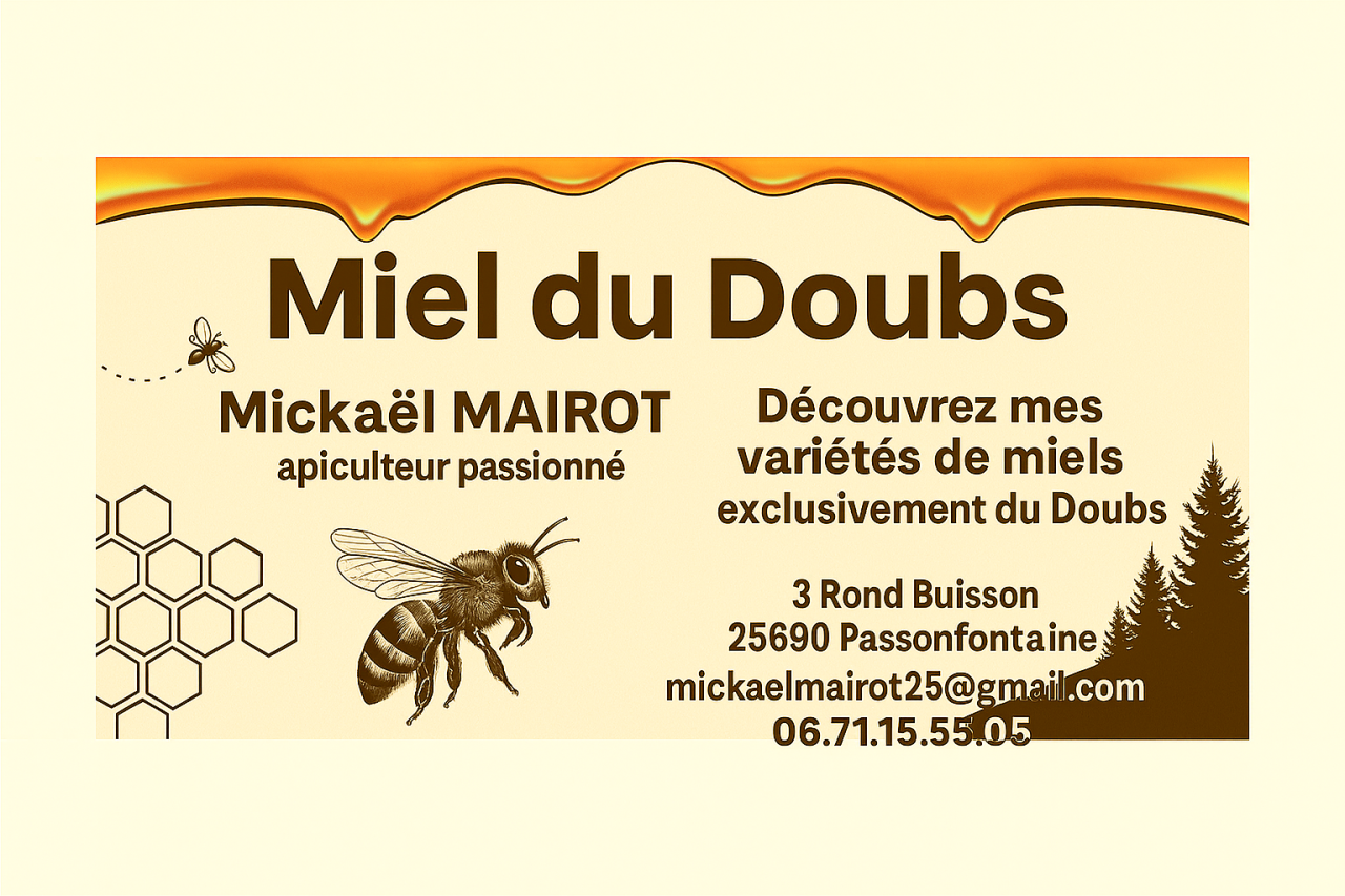 Petit apiculteur Passionné disposant de 4 ruchers fixes (Passonfontaine, Echevannes, Saint Juans, Ougney Douvot), Apiculture artisanale de petite taille, production locale uniquement du Doubs, pas de revente.