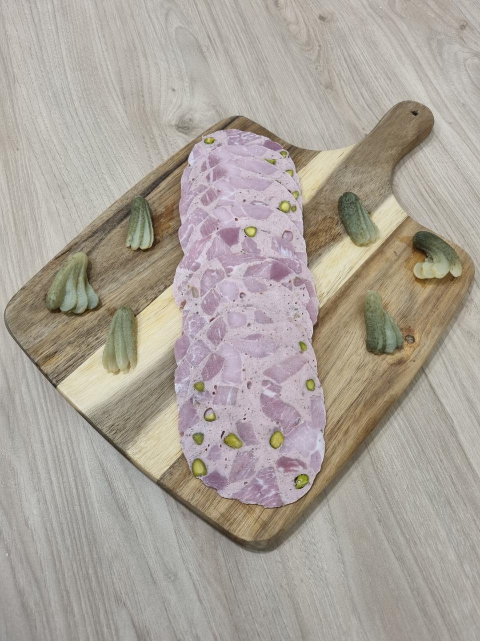 La Maison du Cochon vous propose de la charcuterie sous forme de saucisse de jambon tranchée.