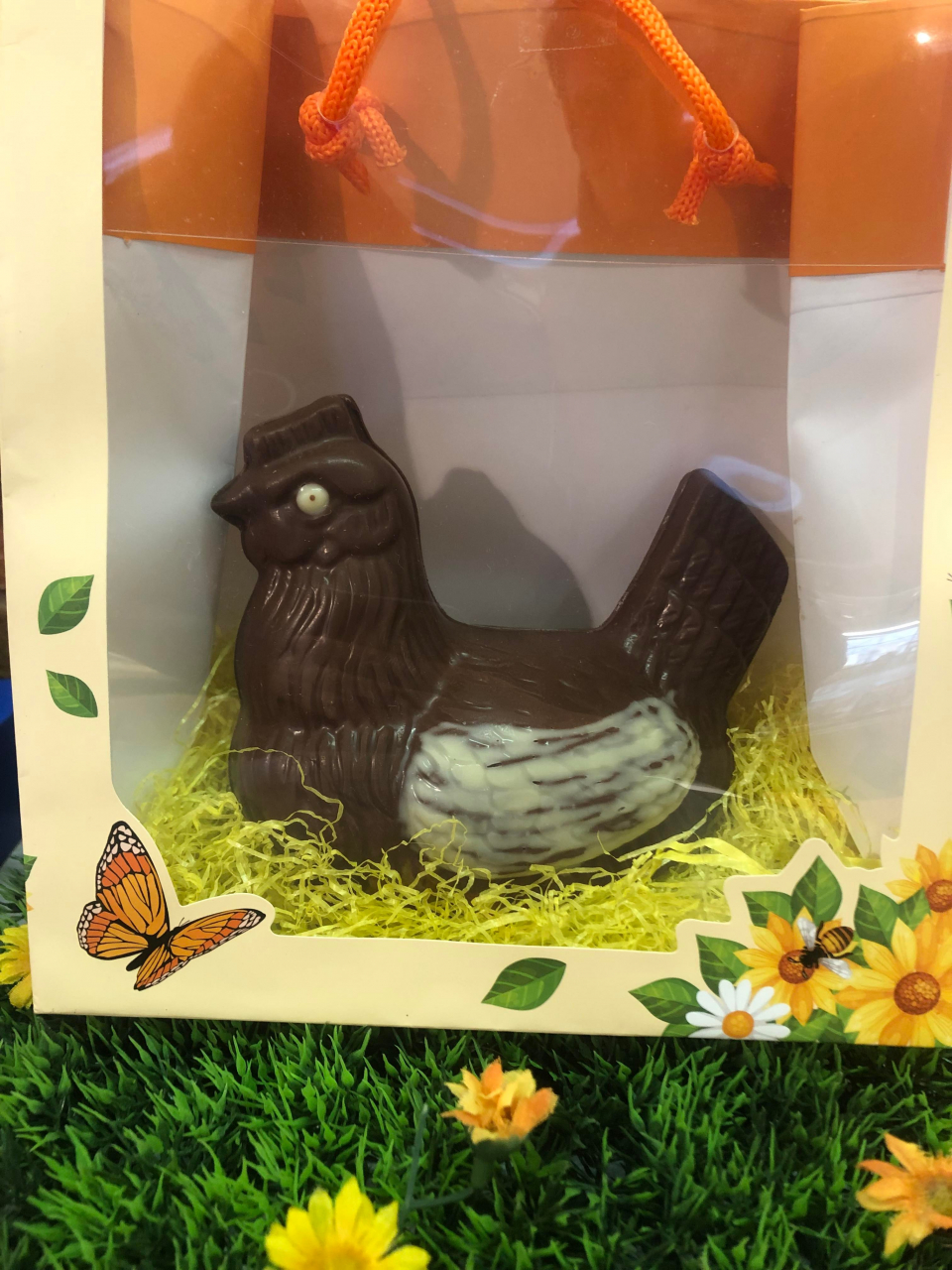 Voilà une grosse poule toute mignonne tout en chocolat au lait .