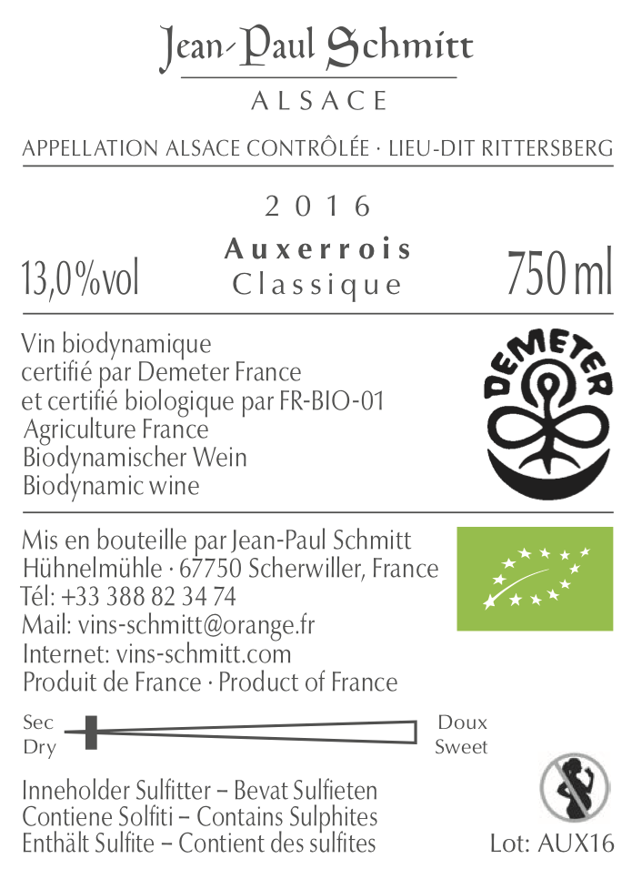 Conditionnement : bouteille de 75 cl Durée de conservation : 2028 Ingrédients : Auxerrois Colorants ou arômes : non - vin certifié par Demeter Origine : Alsace