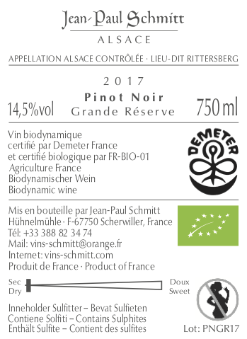 Rouge grenat aux légers reflets violets. Que de précision et de finesse dans le bouquet de ce Pinot Noir. Je ressens des notes épicées, minérales et fruitées, le tout dans une parfaite harmonie. La mise en bouche confirme la logique du nez ; elle est précise et fruitée. Ce Pinot se révèle d’une manière filigrane, délicate, pour finalement afficher de la structure et une puissance contrôlée au travers de tannins racés et porteurs. Ils ont la substance nécessaire pour s’accommoder de la structure. Finale persistante. Ce vin est une sorte d’aboutissement pour Jean-Paul Schmitt, je pense. Il reflète le grand potentiel du terroir du Rittersberg et du vigneron ! Dans une logique où chaque détail est en place, où chaque élément contribue à la grandeur du vin, on ne peut que ressentir de l’admiration et du respect.