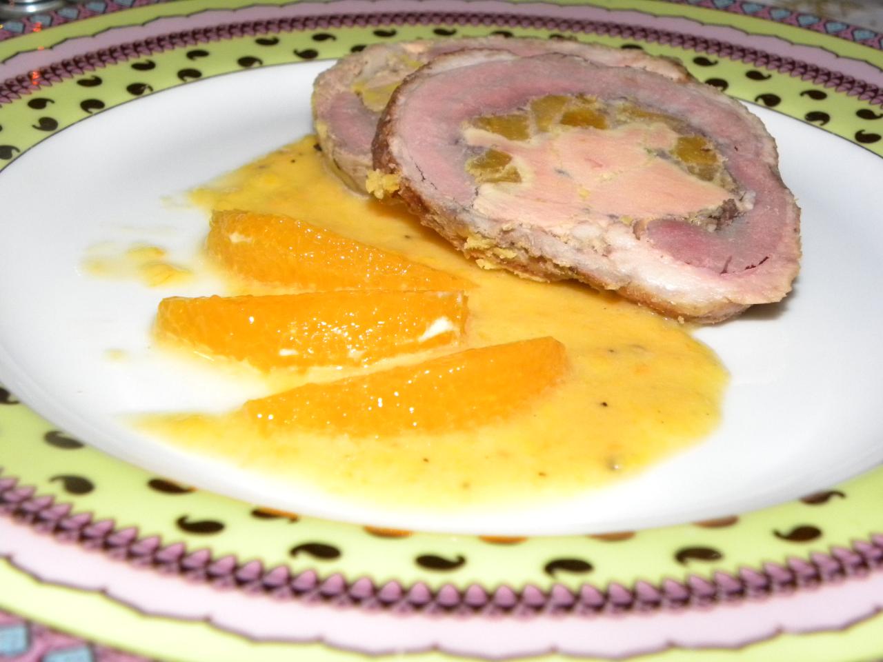 Ballotine de canard farci au foie gras, duo de purée panais patate douce, sauce aigre duce à l'orange