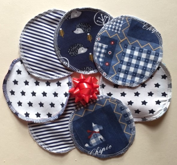 Le tout est en coton Oekotex de divers motifs bleus d’un côté, doublé de coton molleton ou d’éponge de l’autre côté ,