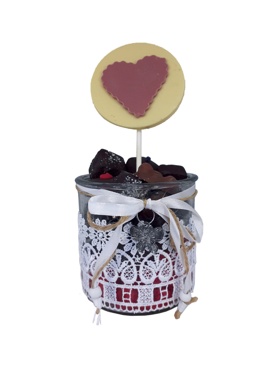 Et petite touche finale : la sucette en chocolat blanc décorée d'un cœur en chocolat ruby.
