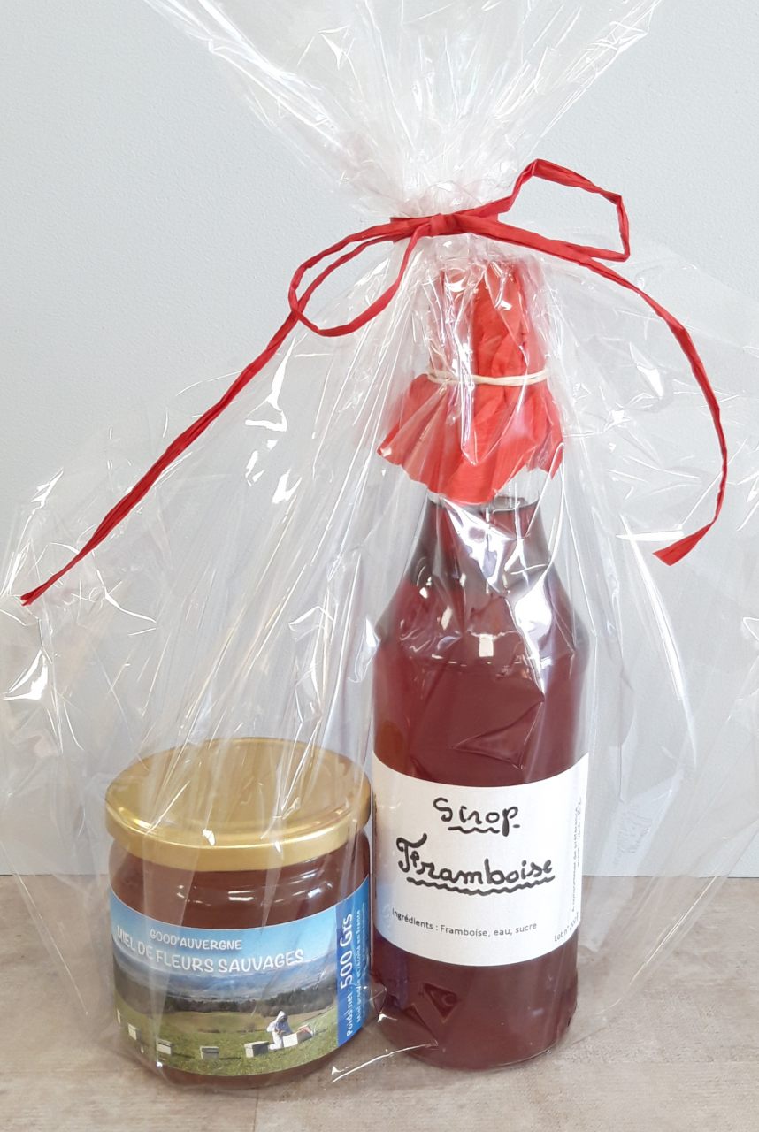 Cet assortiment contient 2 produits, 1 sirop de fraise 50 cl et un miel montagne 500g , emballé dans un papier cristal idéale pour offrir
