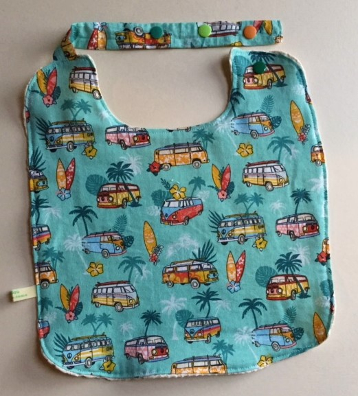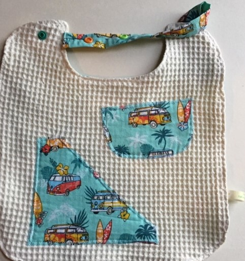 Chaque bavoir est unique, l’envers est décoré de motifs surpiqués, les décorations ainsi que la couleur des pressions sont différentes sur chaque bavoir.