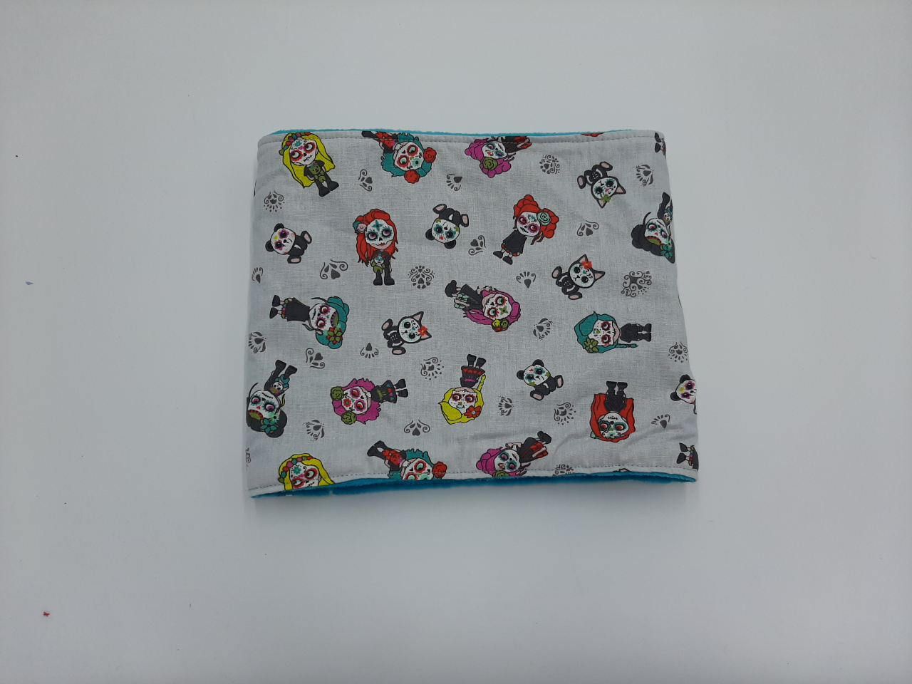 Composé d'un coté polaire doudou épais bleu canard et d'un côté coton imprimé.