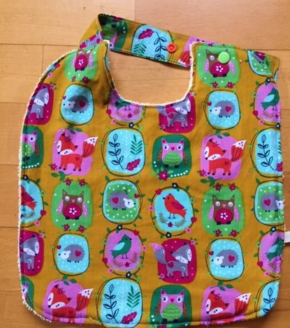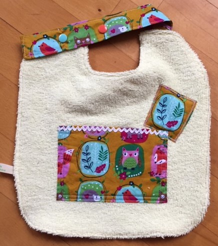 Chaque bavoir est unique, l’envers est décoré de motifs surpiqués, les décorations ainsi que la couleur des pressions sont différentes sur chaque bavoir, celui-ci a une poche bordée d’un croquet .