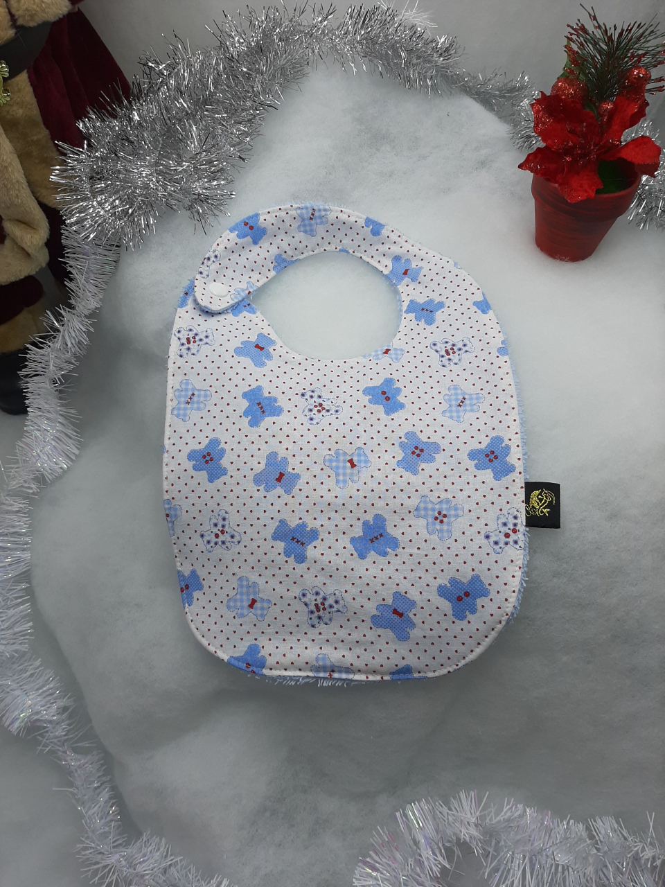 - un bavoir en éponge de coton bleu clair et imprimé ourson, fermeture par pression blanche.
