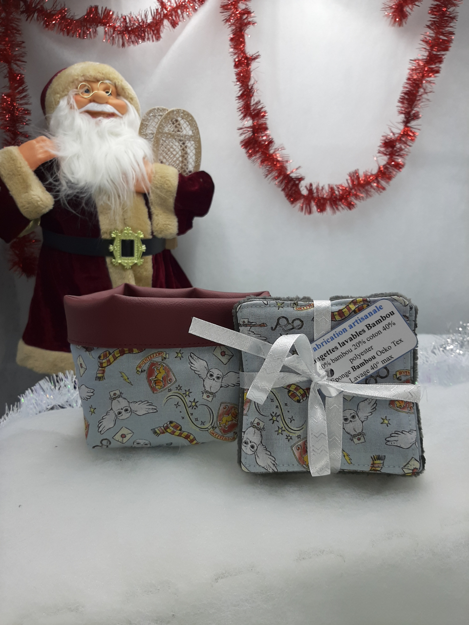 - 1 éponge lavable (machine à laver - sèche linge). Cette éponge peut soit être utilisée comme petite éponge de salle de bain, ou comme éponge de corps pour le bain, puisqu'un côté est en éponge de coton (par contre une fois le choix fait on évite de changer sa fonction..????)