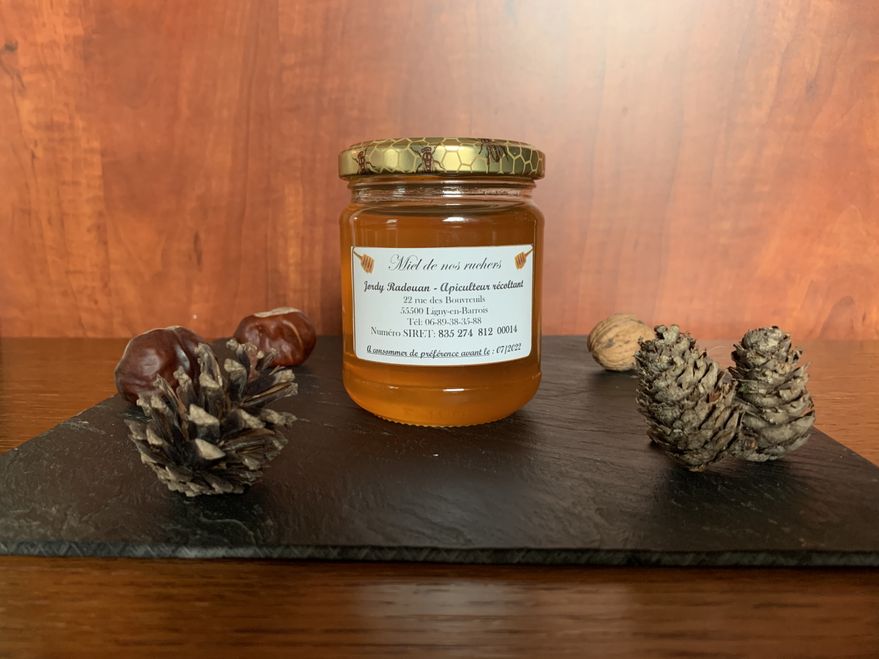 Conditionnement : Pot en verre Durée de conservation : 2 ans Ingrédients : Miel de Forêt Colorants ou arômes : Aucuns Origine : Miels de nos ruchers (Ligny-en-Barrois)