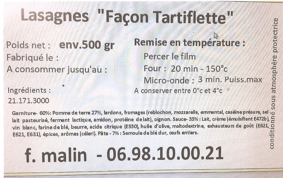 Pommes de terre, lardon, oignon, reblochon, vin blanc, fromage(Voir la liste complète des ingrédients, allergènes compris, dans la galerie d'images à droite)