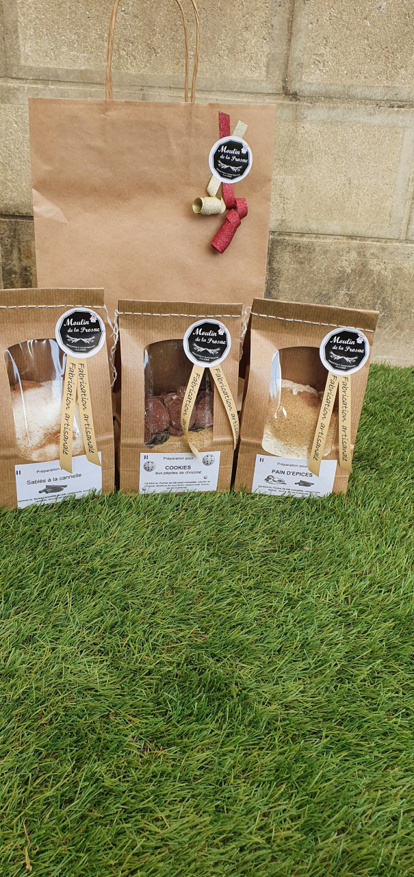 Sac kraft avec 3 préparations sucrées plus un emporte pièce: des sablés à la cannelle (350g) à faire par exemple avec de jolis emportes pièces (flocons, sapins, rennes, ...), un pain d'épices (310g) tout doux à déguster avec un peu de beurre et des cookies chocolat noir et lait (330g) pour le père Noël.