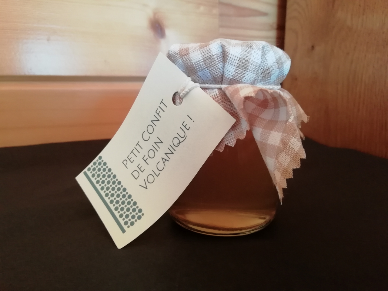 Confit à base de sucre, de tisane de foin de prairie naturelle sur sol volcanique, de vin blanc et d'épices. Accompagne les fromages en particulier Fourme d'Ambert et Bleu d'Auvergne AOP