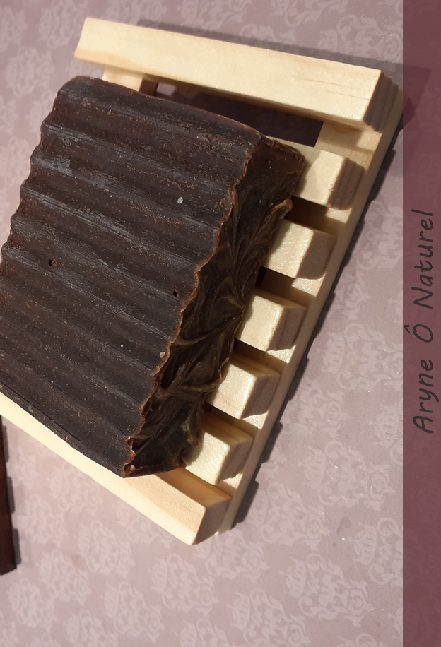 Un savon Le Kakao sur son porte savon en bois dans un emballage prêt a offrir pour un cadeau tout chocolaté !