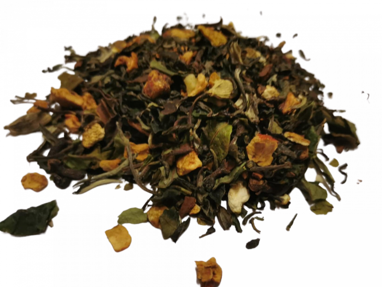 Conditionnement : sachet ziper Ingrédients : Thé vert Sencha de Chine Chun Mee thé blanc Pai Tan pomme bâtons de cannelle écorces d’Orange gingembre arôme naturel cardamone