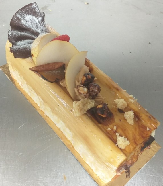 Elle se compose d'un biscuit amandes, d'une mousse poire avec ses poires pochées caramelisées incorporé le tout recouvert d'une mousse caramel.