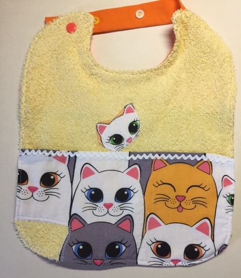 Réalisé en coton Oekotex motif chats sur l’endroit, il est doublé d’éponge jaune décorée du même motif sur l’envers.