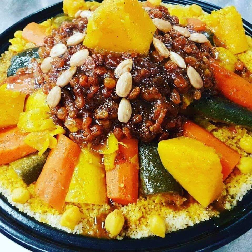 Ingrédients : Agneau, pilon, merguez ,légumes de saison, pois chiche , semoule et confit d'oignon aux raisins secs