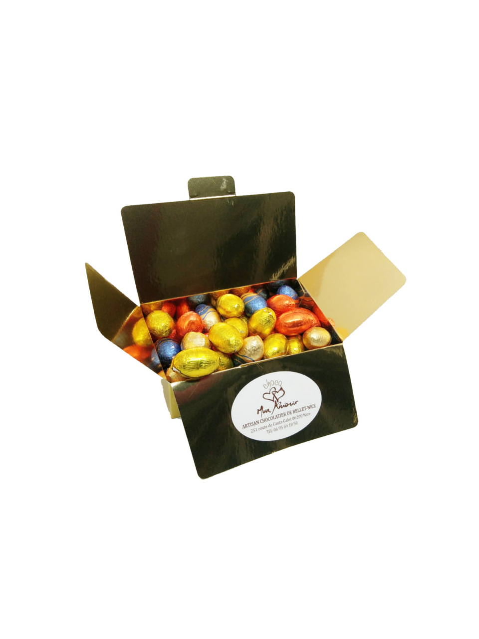 Ces petits œufs pralinés sont faciles à cacher grâce à leur emballage. Nous vous proposons un assortiment de petits oeufs au lait et noir. A vous de jouer!