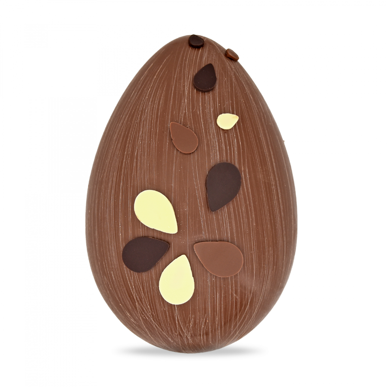 Un grand œuf au chocolat au lait, renfermant une tablette, des carrés de Pâques, des petits œufs fins et des œufs pralinés.