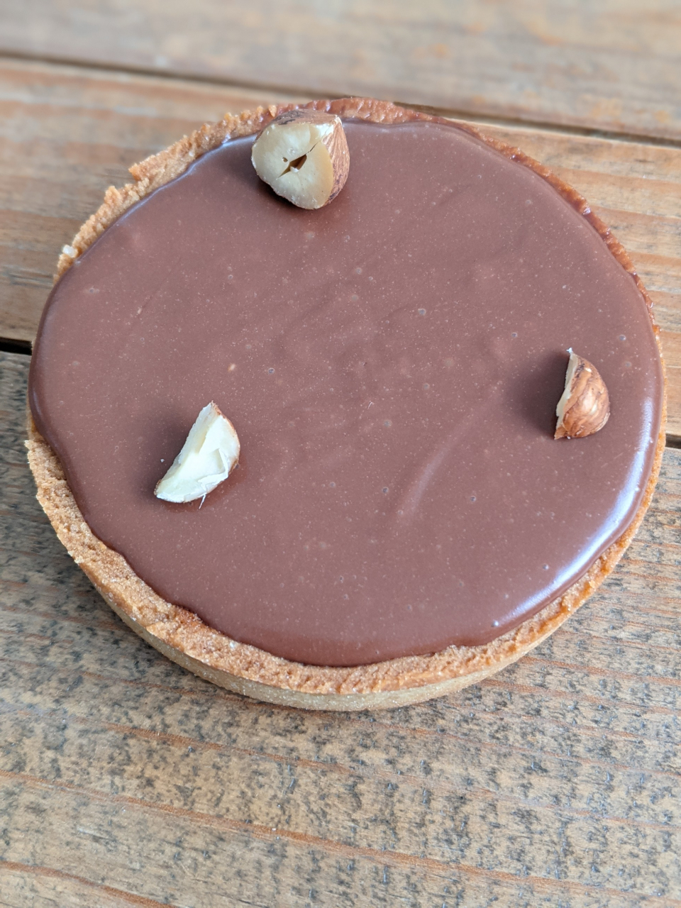 C'est une couche de crème d'amandes et noisettes recouverte de noisettes torréfiées et d'une ganache de chocolat au lait. Cette tarte est faite maison et tous les ingrédients sont issus de l'Agriculture Biologique. Retrouvez-là dans plusieurs formats :