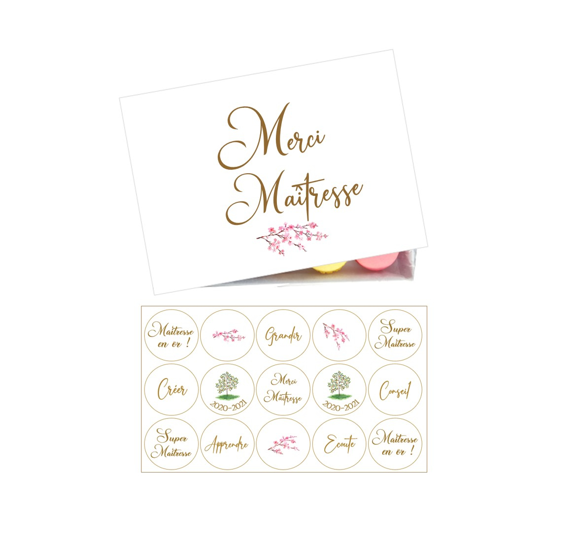 Le coffret présente sur le couvercle l'inscription "Merci Maîtresse", les macarons décorés sont posés à plat avec les inscriptions "Maitresse en or !", "Merci Maîtresse", "Super Maîtresse", 'Grandir", "Créer", "Conseil", "Apprendre", "Ecoute" et la période de l'année scolaire "2020-2021". Il est possible de concevoir un coffret "Merci Maitre", Merci "Directrice" ou "Merci Directeur".
