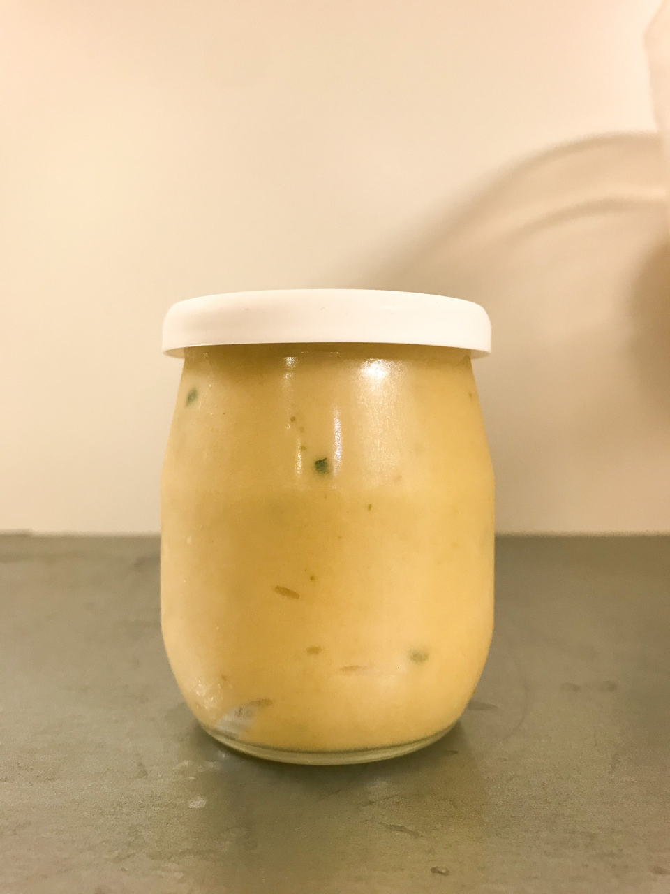 Il s'agit d'une verrine individuelle. Le format est fait pour 1 personne, en accompagnement d'un plat ou d'un dessert, type café/ thé gourmand. Des assortiments de glaces/ sorbets y sont fait, ici il s'agit de notre sorbet à la Nectarine Jaune, dans lequel du Basilic Frais y est ajouté. Tout est fait maison, à base de produits locaux et bio.
