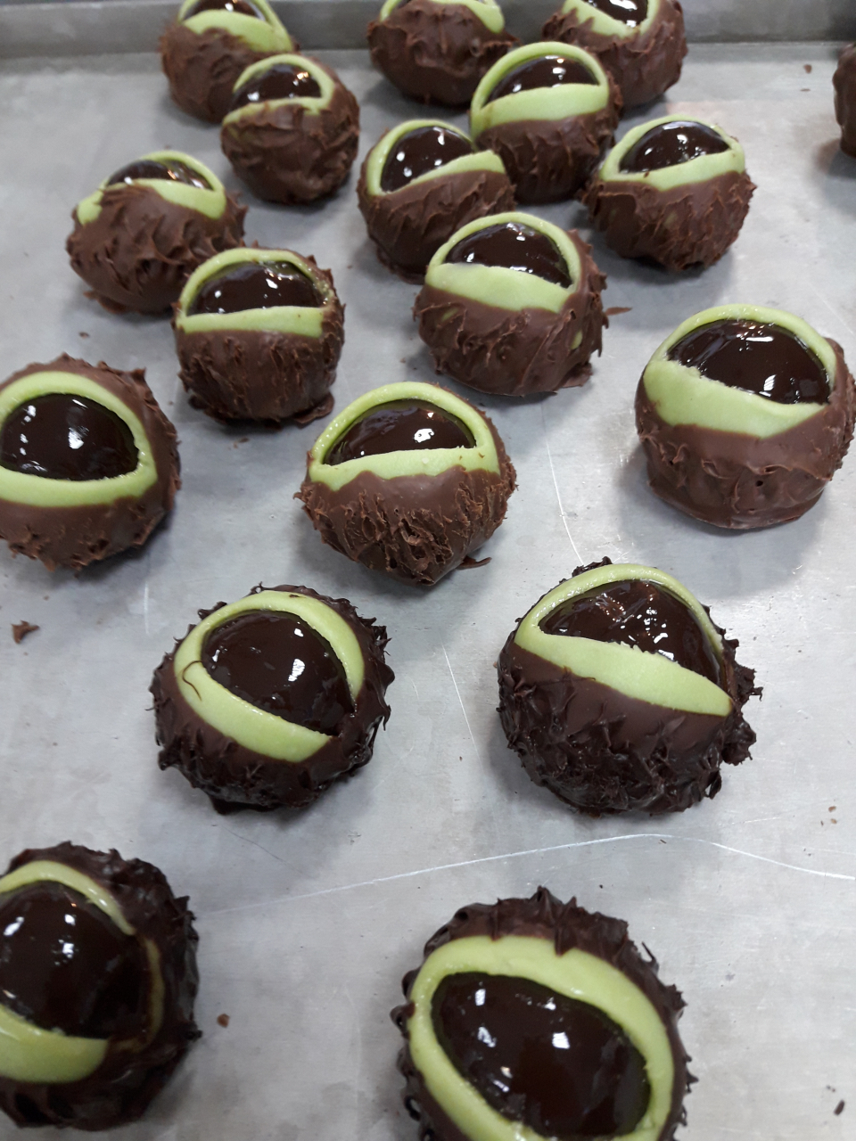 Elles sont composées d'une ganache praliné et enrobées de pâte amande et de chocolat au lait.