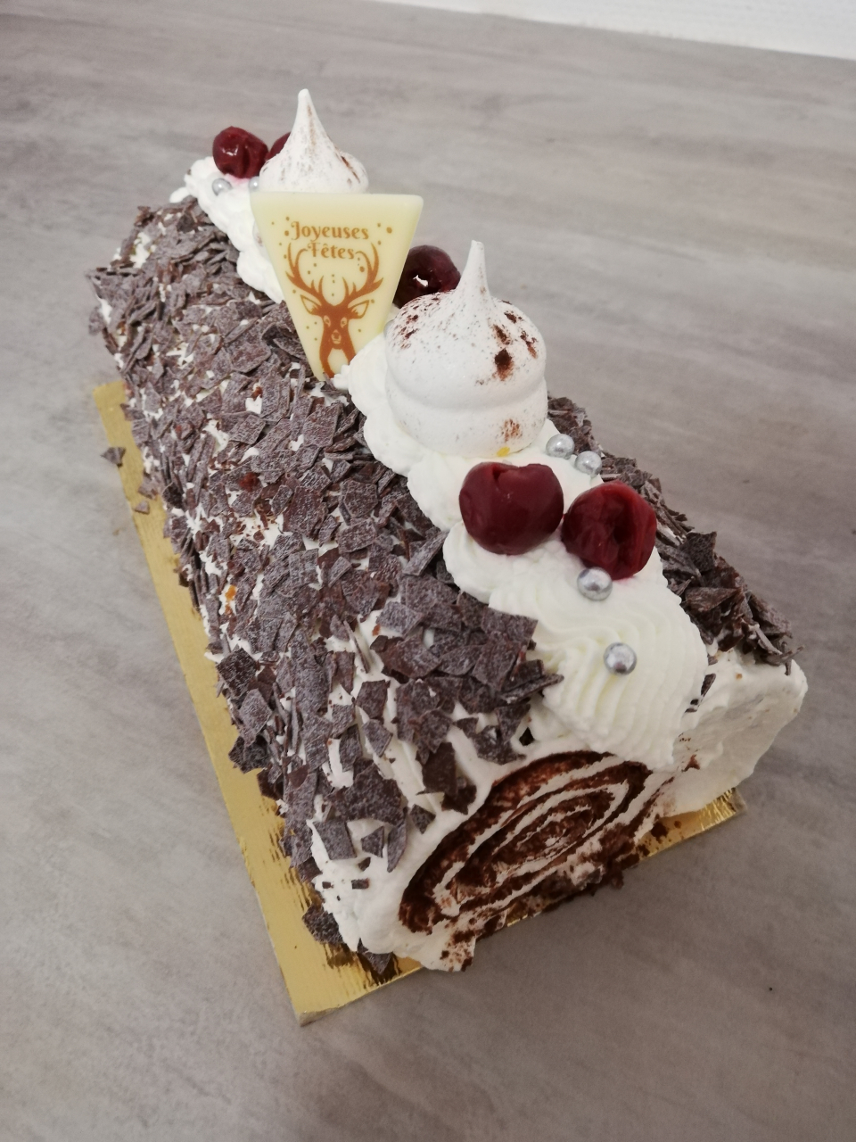 La Fabrique de Juju vous propose à l'occasion des fêtes de fin d'année, la bûche forêt noire 6/8personnes.