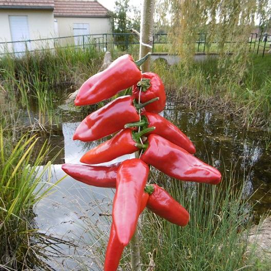 J'ai eu envie de faire comme au Pays Basque et de vous proposer une corde de piments Gorria (qui s'appellent d'Espelette en AOP du Pays Basque). Les cordes comportent 20 piments, je n'en ai mis que 10. On aime moins le piquant en Auxois.