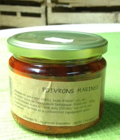 Eh oui dès que possible nous avons grillés au four quelques poivrons, puis une fois épluchés, nous les avons mis en bocaux avec de l'huile d'olive et de l'aïl pour vous offrir des poivrons marinés à tomber !!! Enfin, j'espère : ))