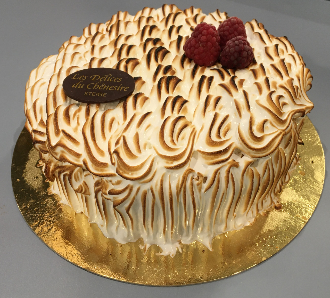 Omelette norvégienne, glace poire (avec des poires d'Alsace) et glace au chocolat (de notre chocolatier Michel Cluizel) entourées de biscuit génoise, et recouverte d'une meringue à l'italienne.