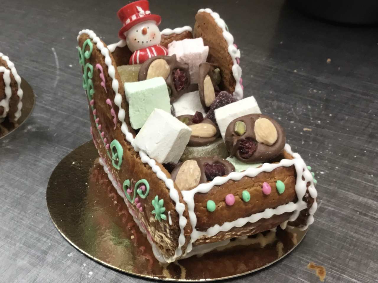 Sablé pain d’épices en forme de traîneau garnie de mendiants, guimauves
