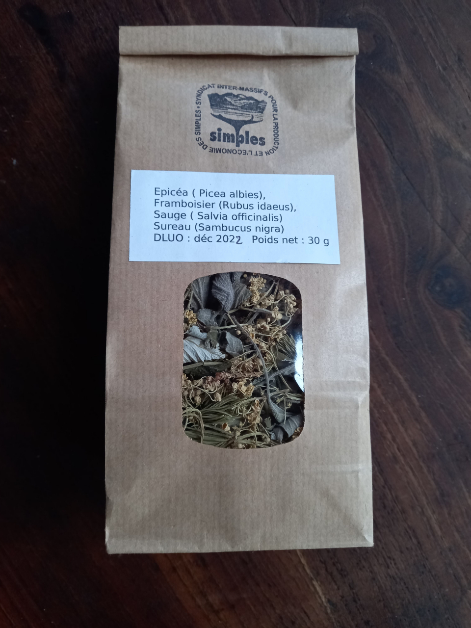 Ingrédients : Epicéa (picea albies)(jeunes pousses), framboisier (rubus idaeus)(feuilles), sauge (salvia officinalis)(feuilles), sureau (sambucus nigra)(fleurs). Proportions variables.