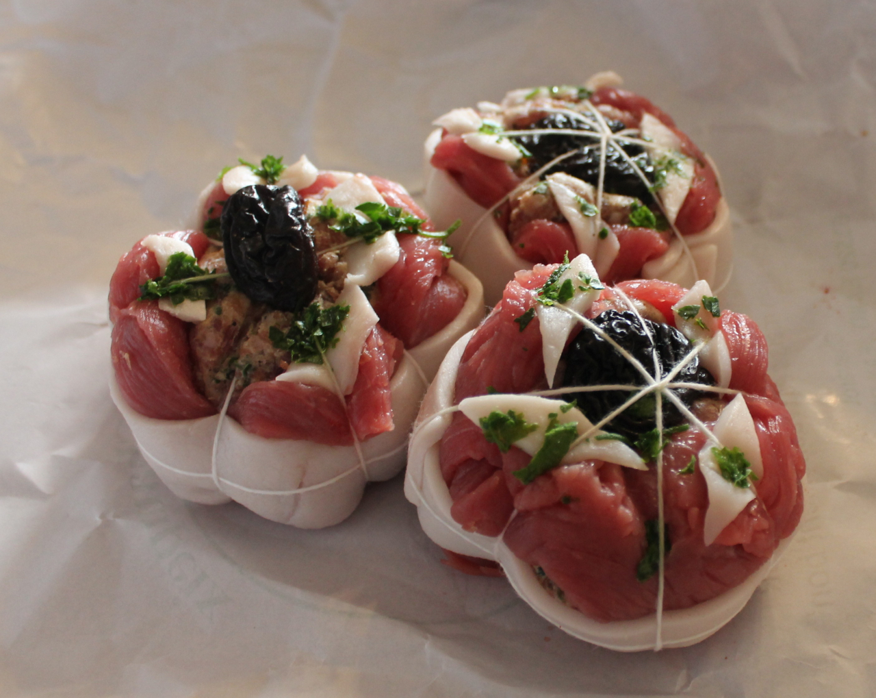 Fleur de veau fourrée aux pruneaux et au foie gras (2 paupiettes).Farce porc et veau.