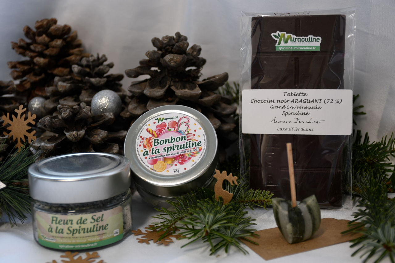 Conditionnement : sachet cadeaux Durée de conservation : 2 ans Ingrédients : sel marin, bonbon à la spiruline, chocolat noir à la spiruline