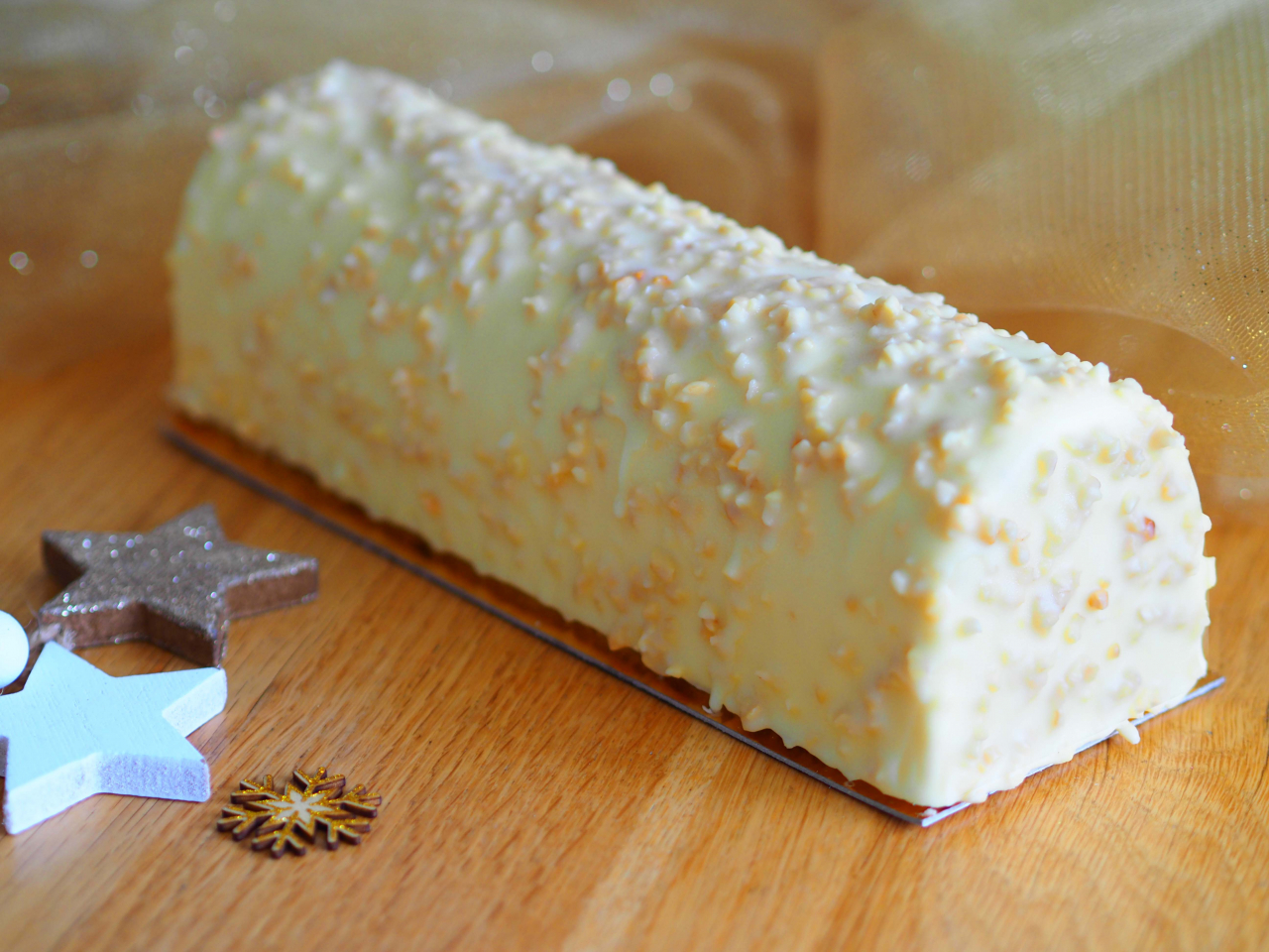 Notre bûche 'étoile des neiges" est composée d'un biscuit aux amandes, une mousse vanille, une gelée de framboises et d'une couverture chocolat blanc aux éclats d'amandes.
