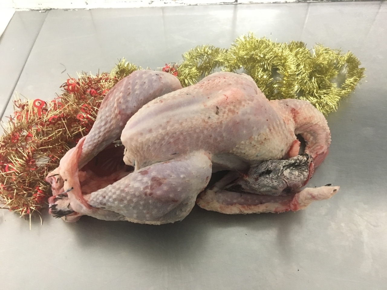 Dinde noire fermière élevée et nourrie aux céréales de la ferme, préparée sur place par nos soins.