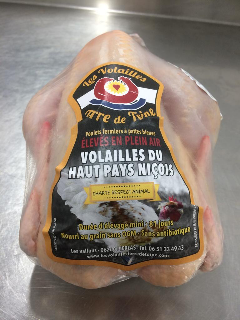 Poulet fermier plein air de qualité élevé à Pierlas Alpes Maritimes, sans OGM... Présenté sous barquette avec les abats prêt à cuire.