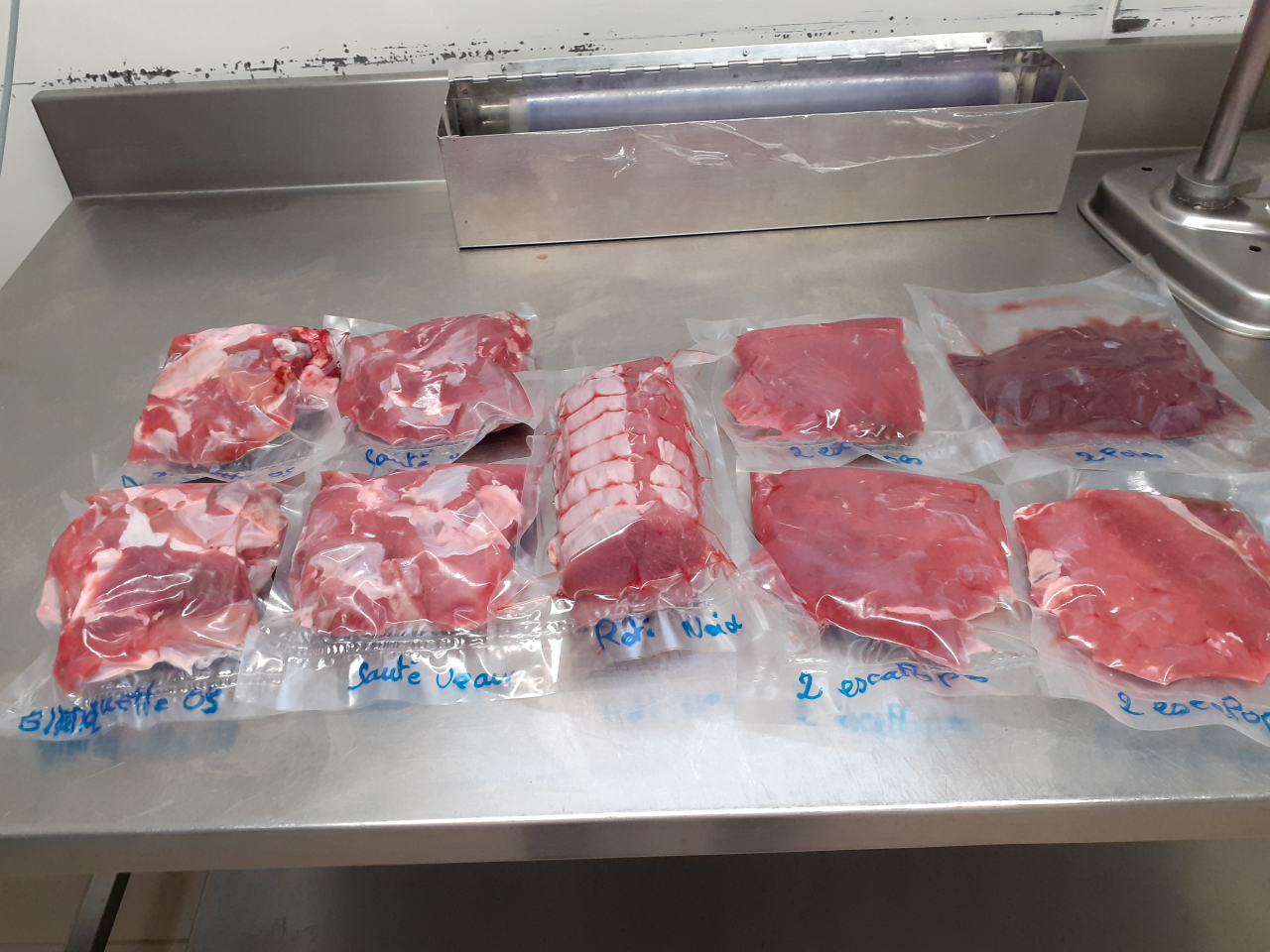 tous les morceaux sont emballés sous vide , par 2 pièces pour les escalopes et les cotes et 500 grs pour la blanquette et le sauté.