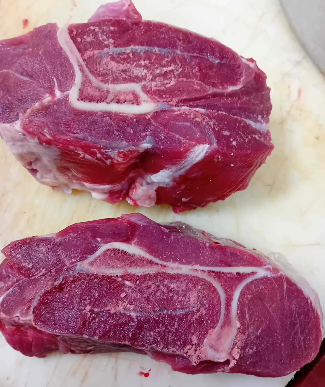 Nos veaux sont élevés sous la mère au pré, ils mangent donc un peu d'herbe en complément du lait, ce qui donne a la viande une couleur rosée.