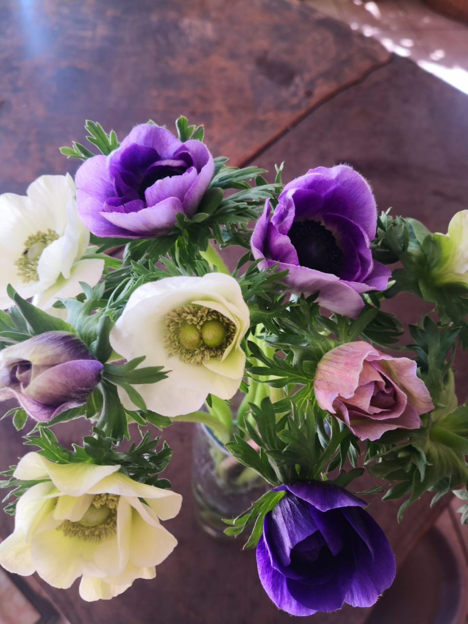 Anémone du Var. Petit Bouquet de 10 tiges avec feuillage. La couleur n'est pas toujours la même, il y a parfois du rose ou du rouge dans le mélange. Même conseil que pour les tulipes pas trop d'eau et éviter les pièces trop chaudes. Vous remarquerez au début qu'elles peuvent se fermer et se rouvrir.