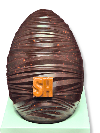 Succombez à cet œuf unique qui combine la tendresse du praliné amande enrobé de chocolat noir avec le croquant des amandes caramélisées incrustées dans une coque en chocolat noir fondant.