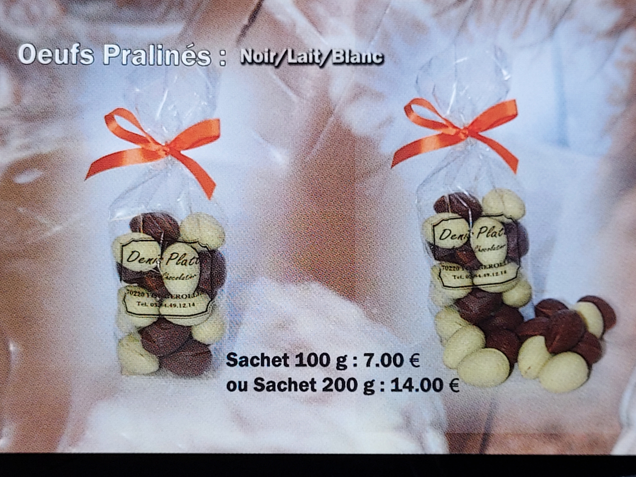 A l'approche des fêtes de Pâques, votre chocolatier, vous propose des petits oeufs pralinés (lait, blanc, noir).