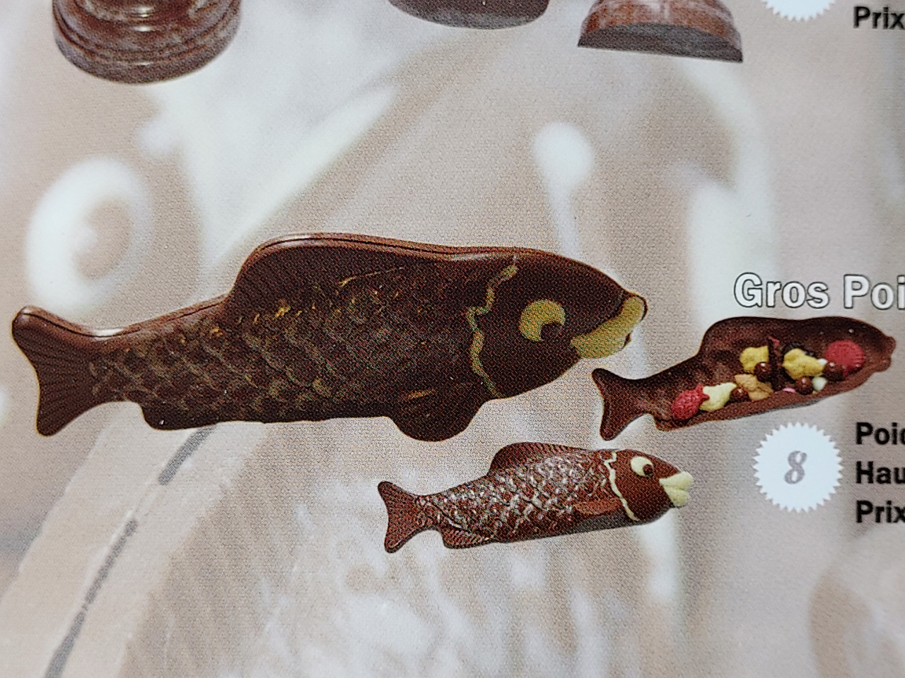 A l'approche des fêtes de Pâques, votre chocolatier, vous propose un gros poisson (noir/lait), d'un poids de 210g pour une hauteur de 25 cm.