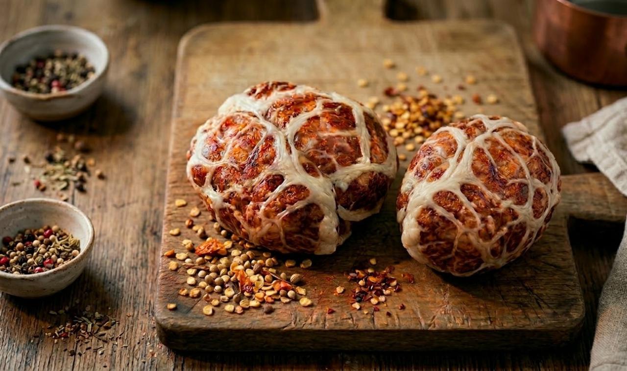 Ingrédients : épaule/pointe et bardière de porc Origine AIN, sel de Camargue (non traité), poivre, paprika, piment de Cayenne, Harissa, 4 épices, crépine.