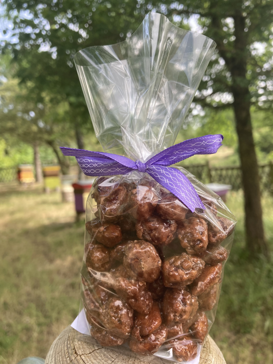 Amandes et noisettes enrobées de notre miel de fleurs d'été, retrouvez le goût des « pralines » ou « chouchous » de votre enfance.