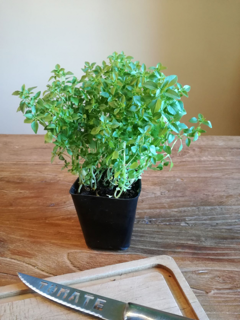 Le basilic 'Grec' à petites feuilles a un parfum puissant. Il se cisaille rapidement au dessus du plat!