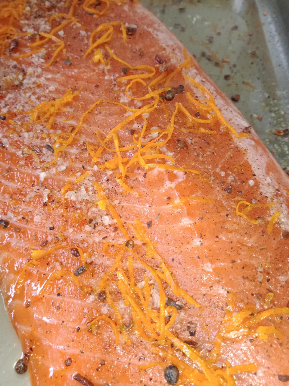 Un beau filet de saumon d'Écosse Label Rouge mariné avec miel, orange et epices